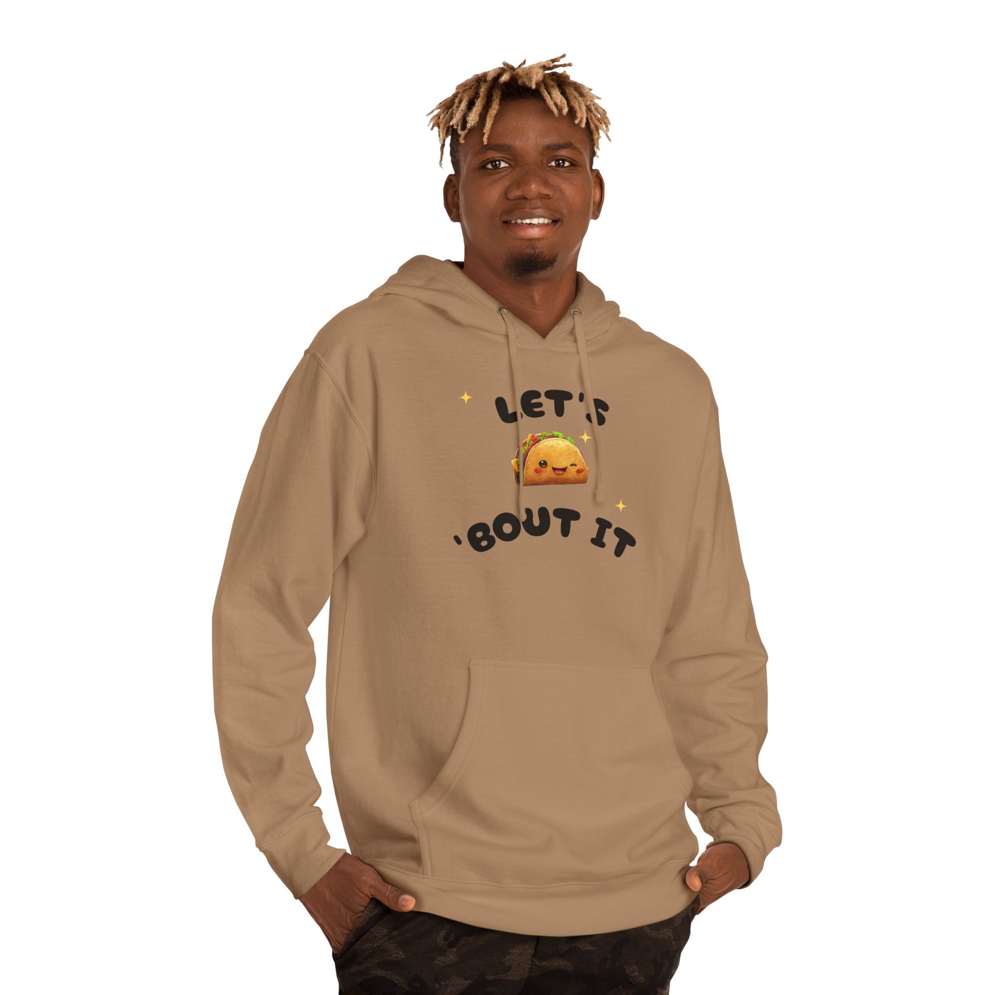 A cozy unisex hoodie featuring a playful 'let's taco 'bout it' design. Perfect for those who love tacos and fun conversations or deep emotional conversations. This hoodie exudes a casual and lighthearted vibe, making it ideal for lounging around or hanging out with friends. Great for taco lovers, foodies, and anyone who enjoys a good chat. Relevant for Taco Tuesdays, casual gatherings, and everyday wear.